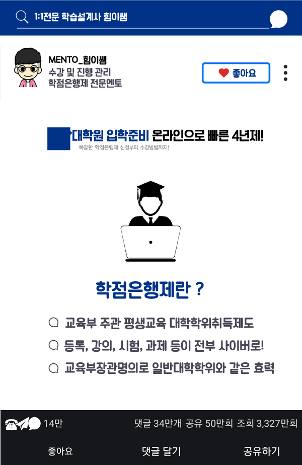 | 직장인 야간대학교 문제, 온라인 학점은행제로 해결! (0) | 2020.01.29 |